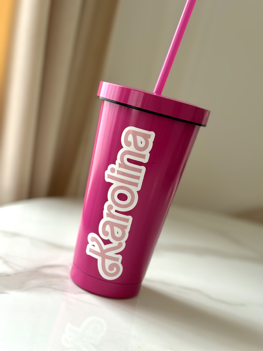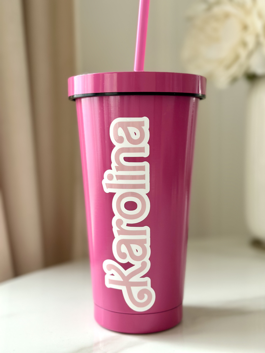 Różowy kubek w stylu Barbie z personalizowanym napisem i słomką. Idealny na panieński, urodziny i inne wyjątkowe okazje.