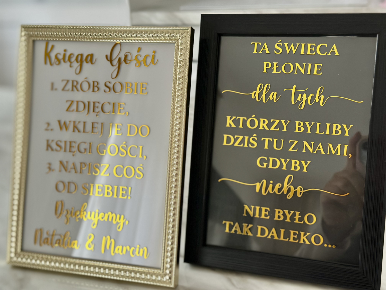 To nie jest zwykła, nadrukowana kartka – napis wykonany jest z trwałej folii winylowej, starannie przeniesiony na taflę szkła, dzięki czemu tabliczka zyskuje elegancki i ponadczasowy charakter. Wystarczy włożyć ją w ramkę z dowolnym tłem (np. lnem, papierem ozdobnym, kwiatami czy zdjęciem), by w pełni dopasować ją do stylu całej uroczystości.