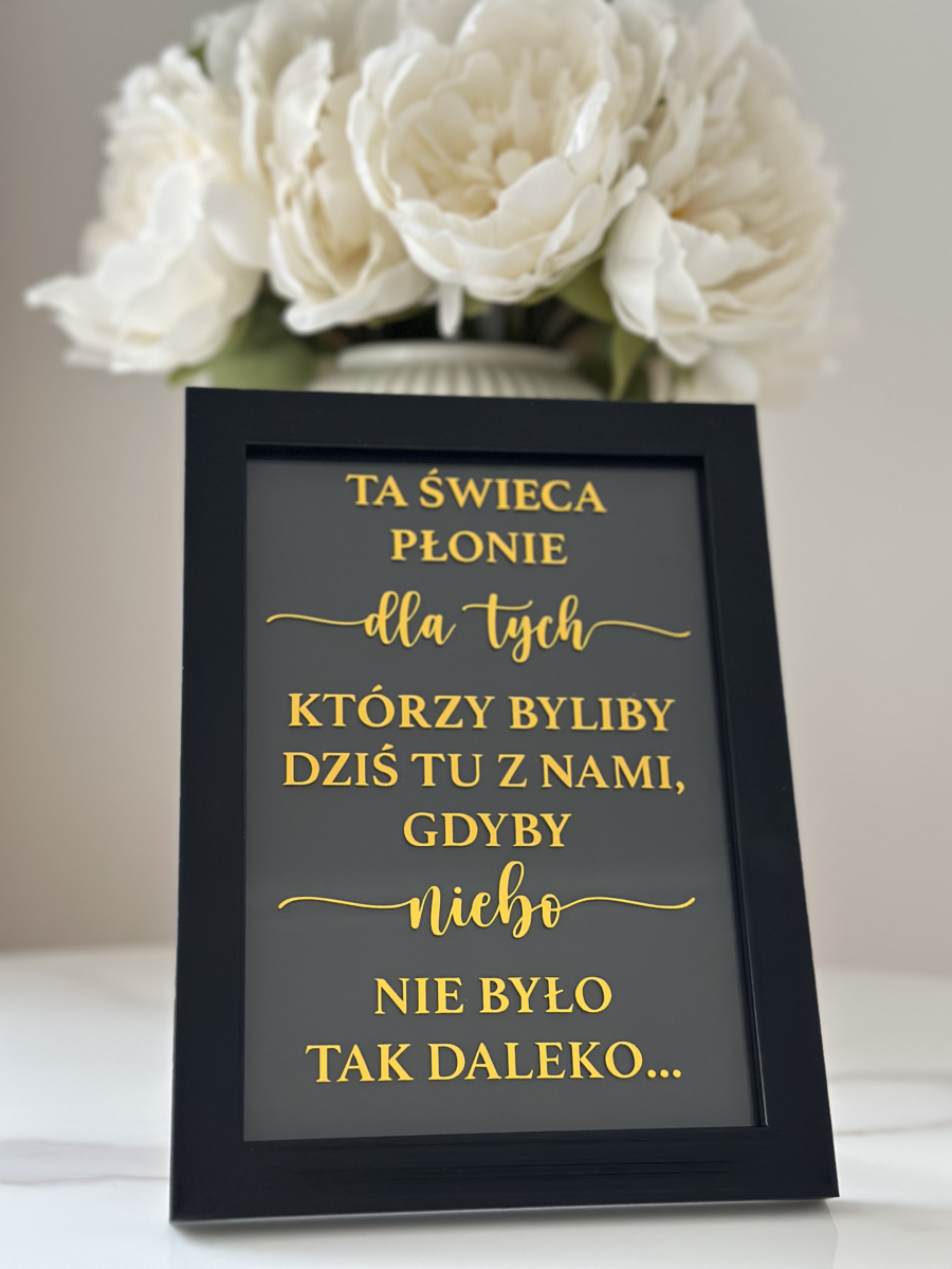 Subtelna i symboliczna — tabliczka ślubna z napisem „Ta świeca płonie dla tych, którzy byliby dziś tu z nami, gdyby niebo nie było tak daleko” to piękny sposób na uhonorowanie bliskich, których zabrakło w tym wyjątkowym dniu.